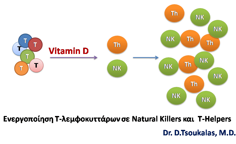 Για να μπορέσουν όμως να ενεργοποιηθούν τα Τ-λεμφοκύτταρα και να μετατραπούν σε κύτταρα που θα σκοτώσουν το μικρόβιο, κύτταρα δολοφόνοι και βοηθητικά κύτταρα (Natural Killers Cells, ΝΚ – Helper Cells, Τh) είναι απαραίτητη η παρουσία της βιταμίνης D σε επαρκής ποσότητες.