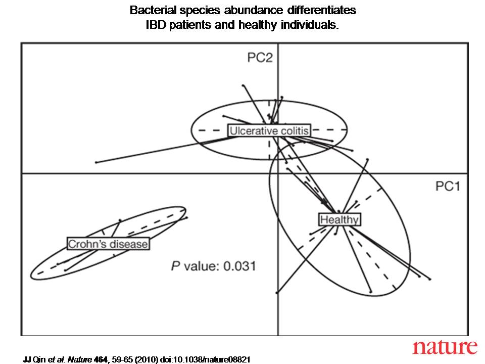 Στην εικόνα φαίνεται η διαφοροποίηση της κατανομής της εντερικής χλωρίδας σε άτομα με φλεγμονώδη νόσο του εντέρου (Crohn και ελκώδης κολίτης) σε συνάρτηση με τη χλωρίδα υγιών ατόμων. Η αλλαγή δηλαδή της χλωρίδας του εντέρου συνδέεται με την εμφάνιση και διαφορετικής νόσου κάθε φορά.