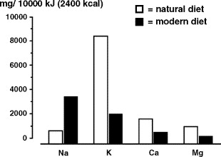 Στο διάγραμμα βλέπετε τη διαφορά σε βασικά μεταλλικά στοιχεία μεταξύ της φυσικής δίαιτας (λευκό) και της σύγχρονης δίαιτα (μαύρο). [Πηγή: Progress in Cardiovascular Diseases 2006; 49:59-75]