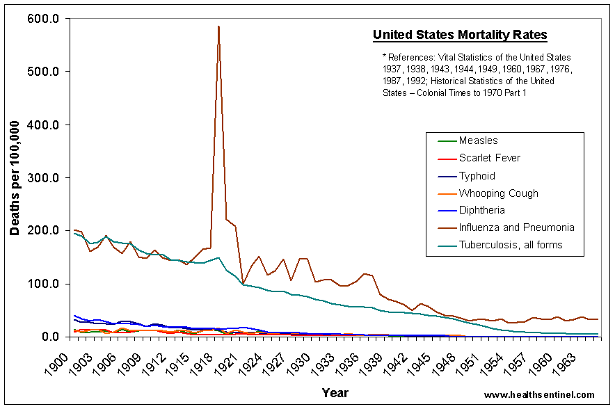 Ακολουθεί γράφημα που δείχνει την πορεία θανάτων από διάφορες μολυσματικές ασθένειες από την αρχή του αιώνα μέχρι το 1965. Μπορείτε να παρατηρήσετε την πτωτική τάση των θανάτων από φυματίωση όπως καταγράφεται σταθερά από την αρχή του γραφήματος μέχρι το τέλος, χωρίς ουσιαστική αλλαγή αυτής της τάσης (πράσινη γραμμή, Tuberculosis) παρά την είσοδο των εμβολίων. Το εμβόλιο της φυματίωσης (BCG) ανακαλύφθηκε το 1921 και άρχισε να εκτελείται μαζικά μετά από τον ΙΙ Παγκόσμιο πόλεμο.
